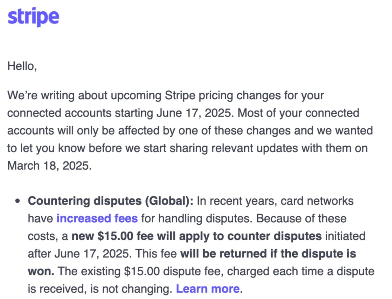 Starting June 17, 2025, Stripe will introduce an additional $15.00 dispute fee for any chargeback that is countered and subsequently lost. This is in addition to the existing $15.00 dispute fee applied to all disputes, meaning: