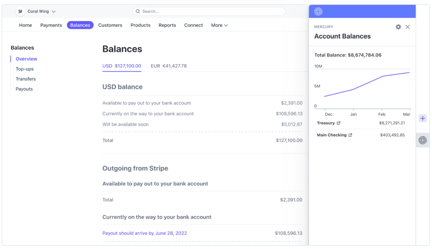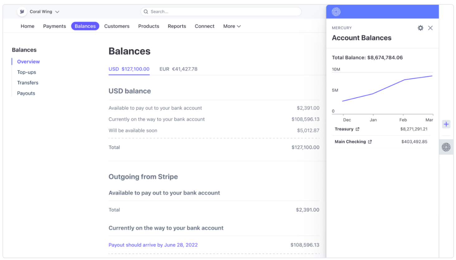 Mercury solidifies itself as the #1 banking platform for startups through it's Stripe app. Mercury's Stripe app allows merchants to see their Mercury balance directly within the Stripe account balance tab. For merchants managing tight working capital, seeing accounts payable / treasury balances directly in Stripe is very convenient.